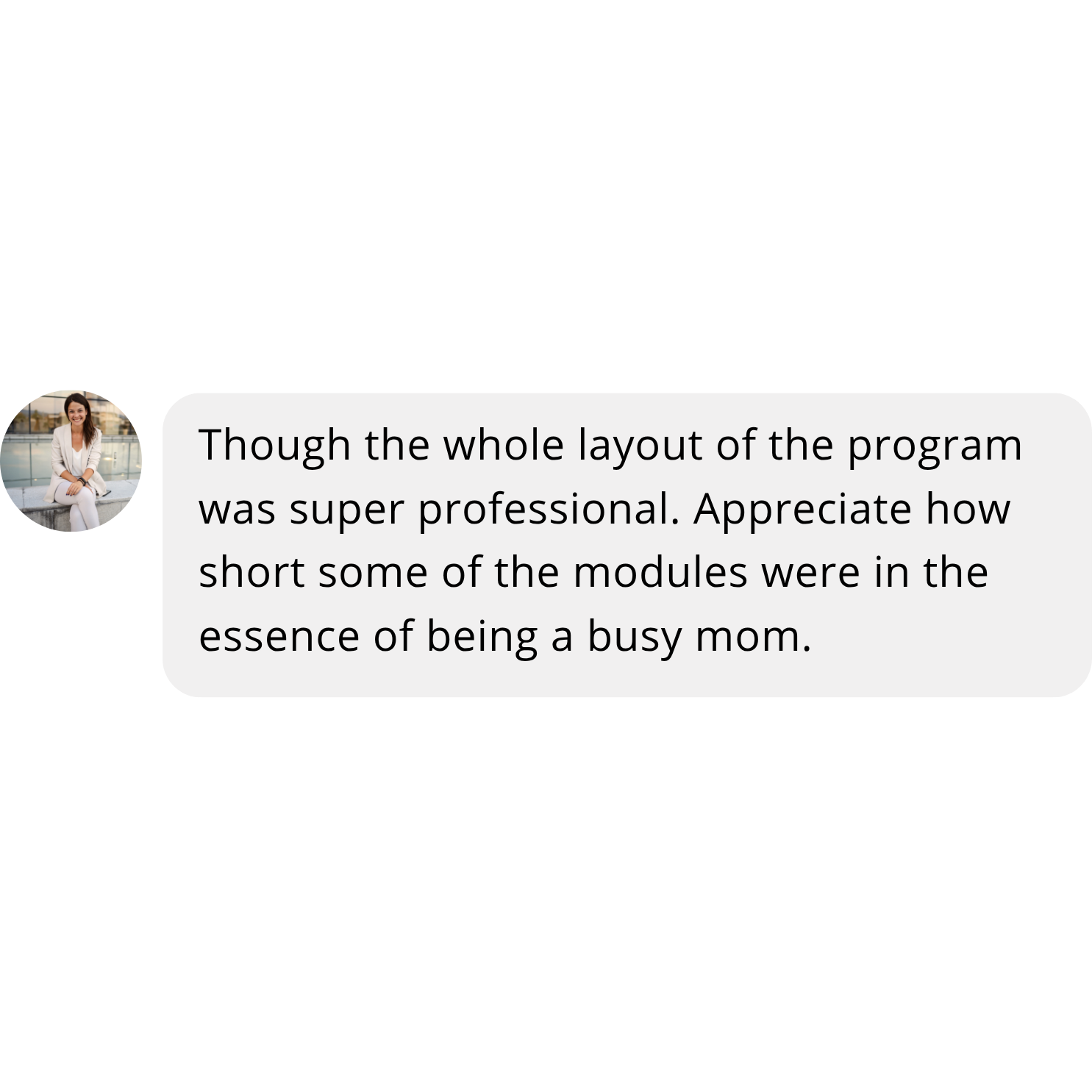 Absolutely. We know one size does not fit all when it comes to balancing work and family. That’s why we offer different tiers of support. If you need more one-on-one time, our 1:1 executive coaching sessions are there for you. Even in the group coaching calls, we keep the groups small so that you can get personal feedback and advice. You'll have access to whatever level of support you need, and you’ll never feel like just a number.